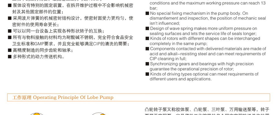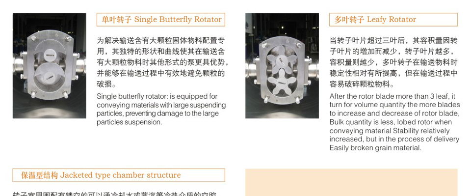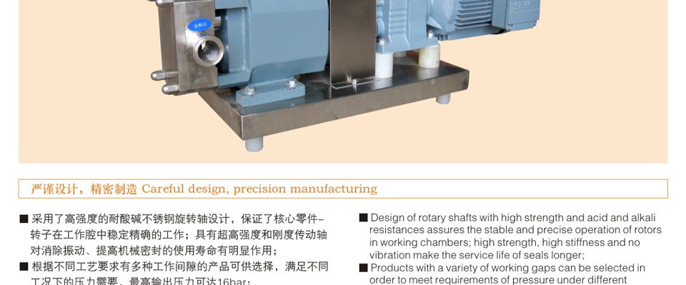 6、轉子和轉子之間絕無接觸,長期使用亦無磨損,運轉平穩,噪音低,效益高。 7、設計新穎、安裝維護簡單容易,方便清洗,保證機器內部和生產衛生清潔。